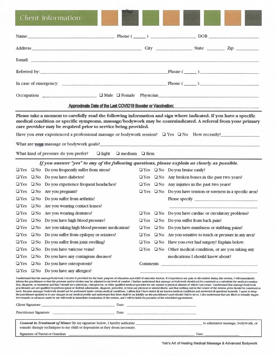 For your very first session, please complete this form and bring it with you, or take a photo of the completed form and email or text it to us.